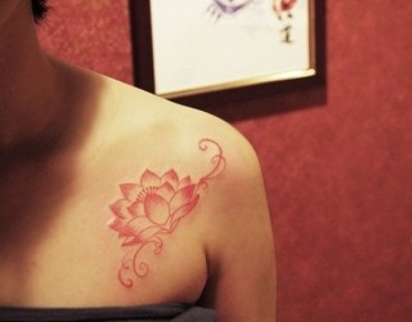 女性肩部彩色莲花刺青_肩部纹身图案大全_纹身图吧
