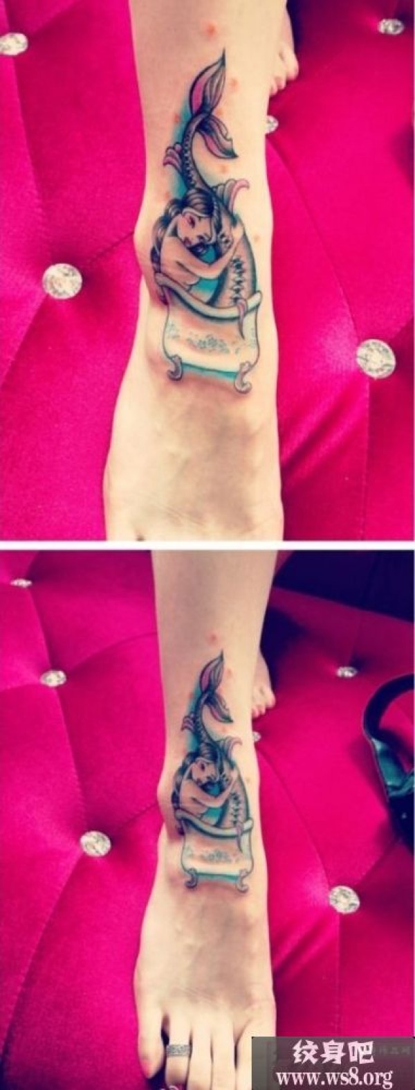 脚背彩色美人鱼洗澡纹身图案_脚部纹身图案大全_纹身图吧
