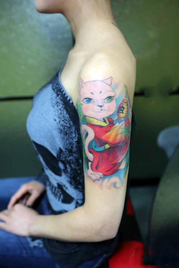 女生手臂穿红袍的猫纹身_肩部纹身图案大全_纹身图吧