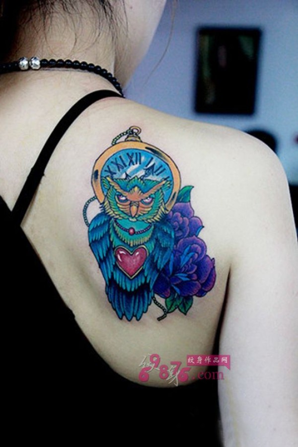 高清猫头鹰与时钟肩部纹身_肩部纹身图案大全_纹身图吧