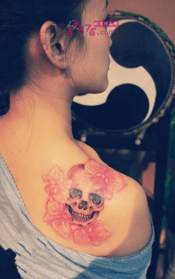 美女香肩粉色小骷髅纹身_肩部纹身图案大全_纹身图吧