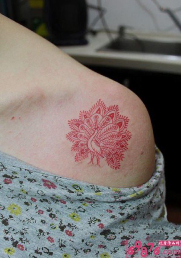 红色小孔雀唯美肩部纹身_肩部纹身图案大全_纹身图吧