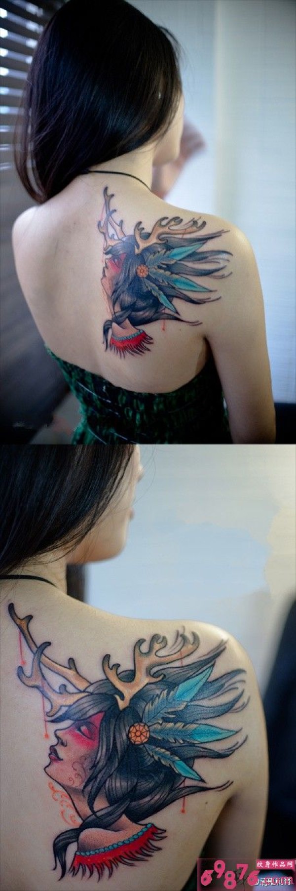 后肩创意羊角美女头像纹身_肩部纹身图案大全_纹身图吧
