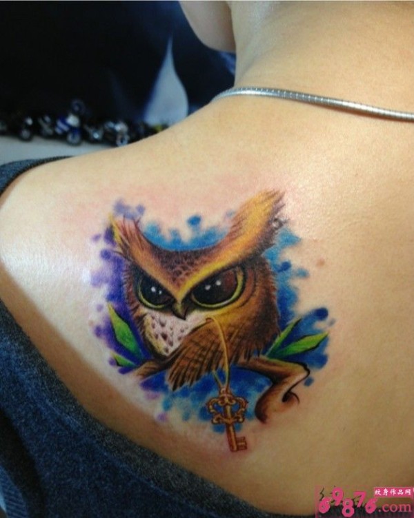 后肩个性猫头鹰叼金钥匙刺青_肩部纹身图案大全_纹身图吧