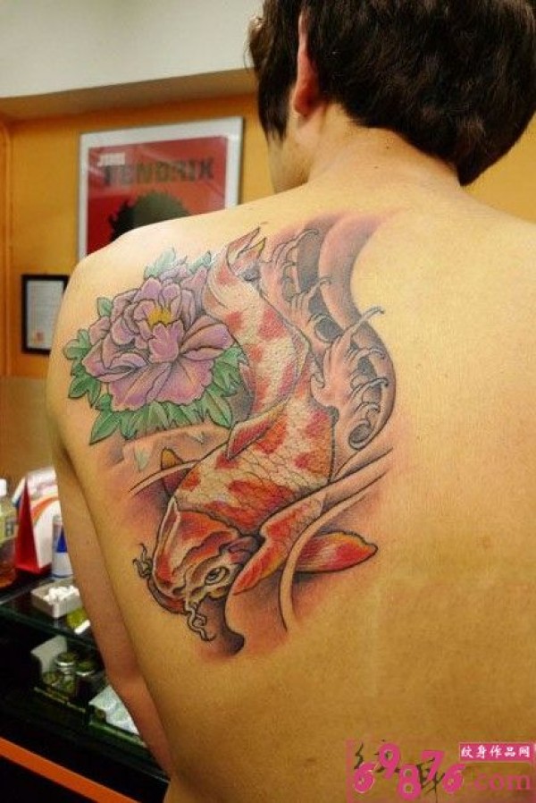 后肩传统牡丹鲤鱼刺青_肩部纹身图案大全_纹身图吧
