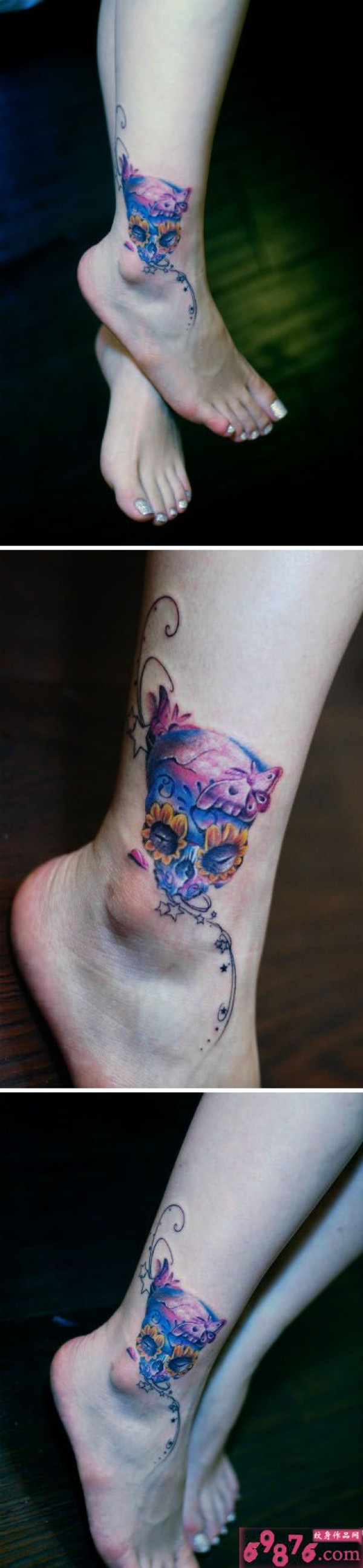 创意太阳花骷髅脚踝纹身_脚部纹身图案大全_纹身图吧