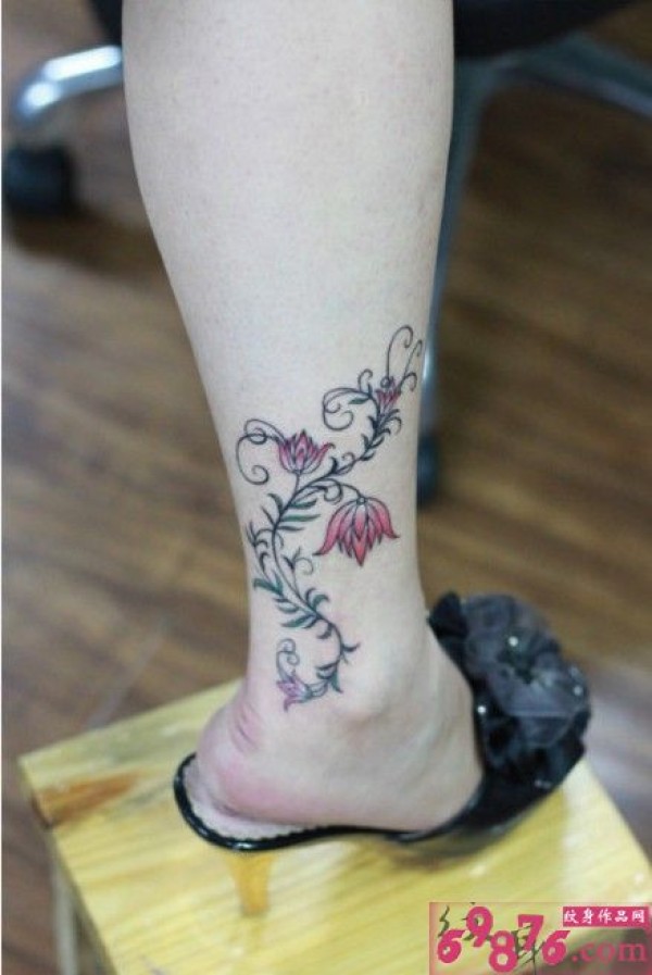 莲花藤蔓脚踝清新纹身_脚部纹身图案大全_纹身图吧