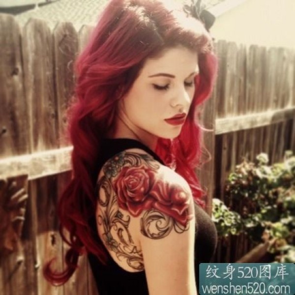 一簇鲜花盛开在美女肩上_肩部纹身图案大全_纹身图吧