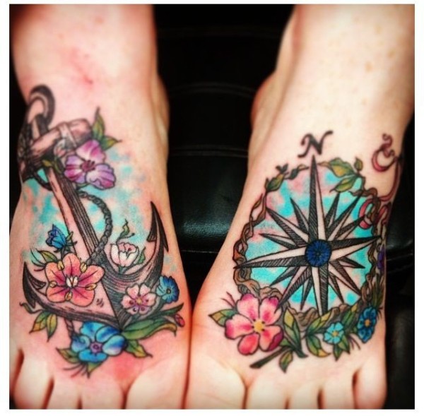 脚部个性纹身船锚和指南针_脚部纹身图案大全_纹身图吧