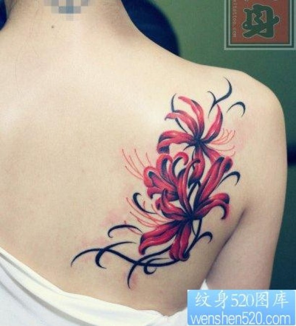 女人肩背精美的彼岸花纹身图片_肩部纹身图案大全_纹身图吧