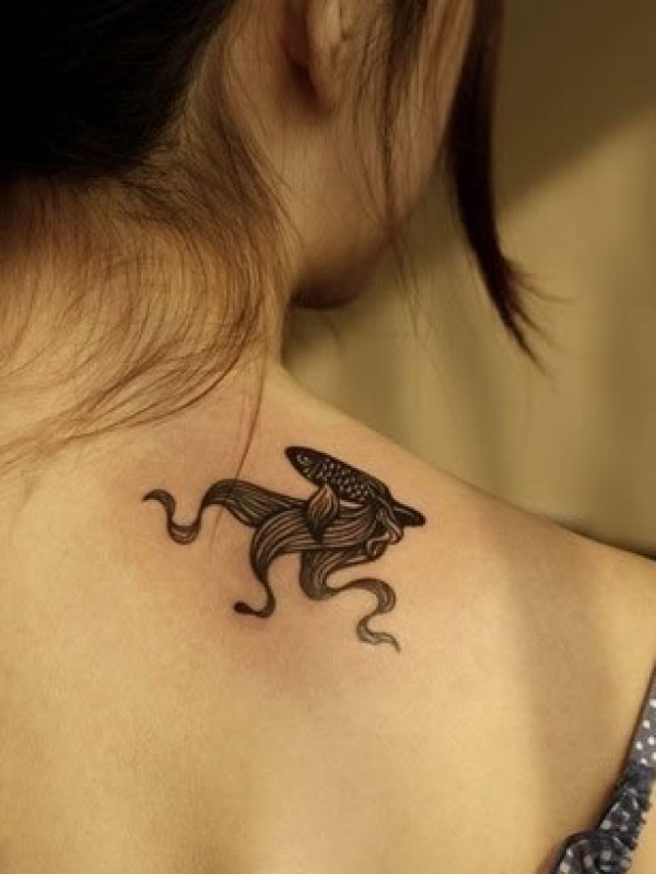 美女侧肩上的素色金鱼图案纹身快乐游动的素色_肩部纹身图案大全_纹身图吧