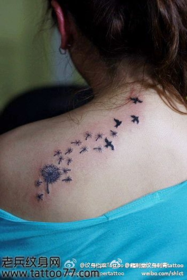 美女肩部时尚流行的蒲公英小鸟纹身图案_肩部纹身图案大全_纹身图吧