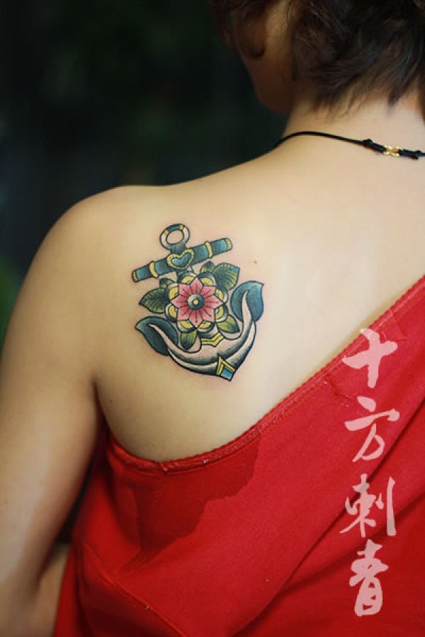 长沙十方刺青66纹身图库作品后肩彩色船锚纹身_肩部纹身图案大全_纹身图吧