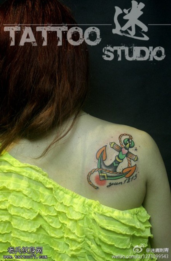 女性肩部彩色船锚纹身图案_肩部纹身图案大全_纹身图吧