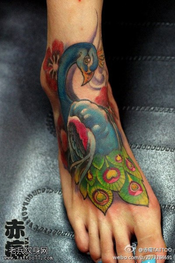 女性脚背彩色孔雀纹身图案_脚部纹身图案大全_纹身图吧