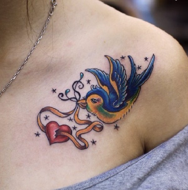 女人纹身图案肩部彩色爱心小燕子纹身图案_肩部纹身图案大全_纹身图吧