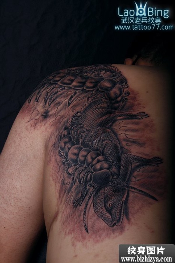 男子右肩黑色大蜈蚣_肩部纹身图案大全_纹身图吧