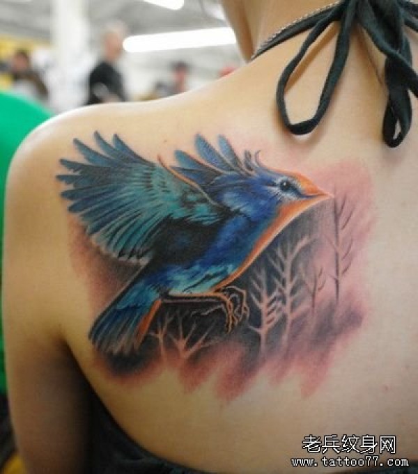 女孩子肩背彩色小鸟纹身图案_肩部纹身图案大全_纹身图吧