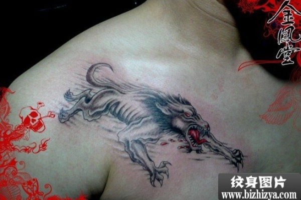 肩部到前胸的奔跑的血狼纹身作品_肩部纹身图案大全_纹身图吧