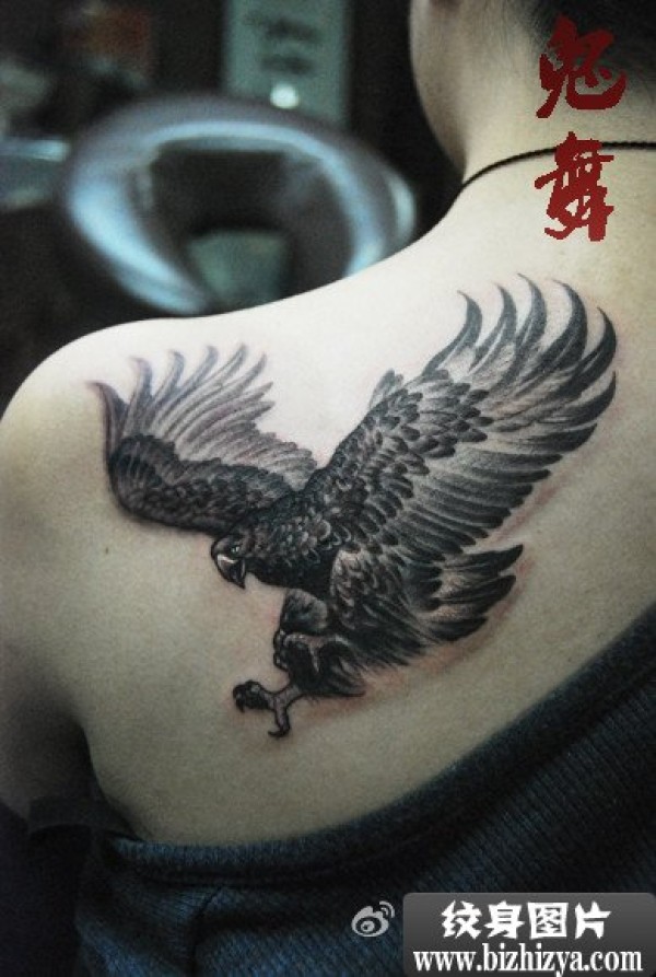 左后肩黑色雄鹰纹身图案鬼舞作品_肩部纹身图案大全_纹身图吧