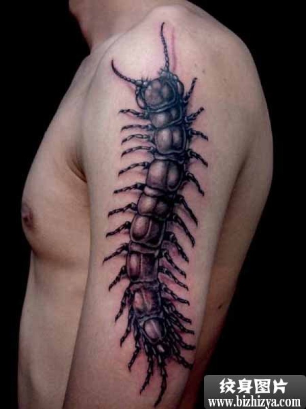 左胳膊到肩膀的黑色大蜈蚣刺青作品欣赏_肩部纹身图案大全_纹身图吧