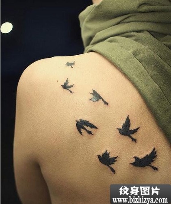 左后肩的成群的小黑鸽纹身图_肩部纹身图案大全_纹身图吧