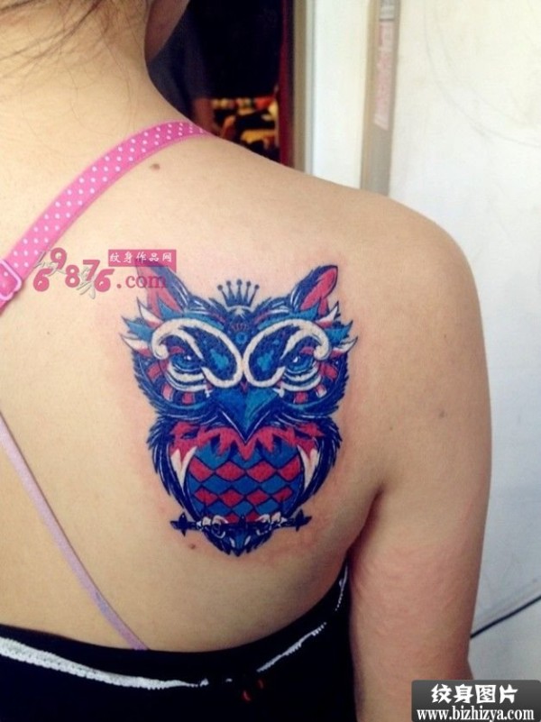 彩色猫头鹰肩部纹身图案图片_肩部纹身图案大全_纹身图吧
