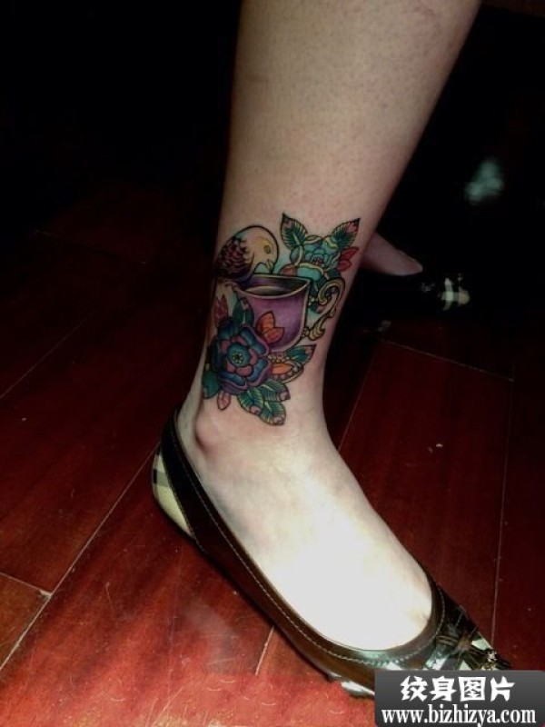 创意鲜花与鸟脚踝纹身图案图片_脚部纹身图案大全_纹身图吧