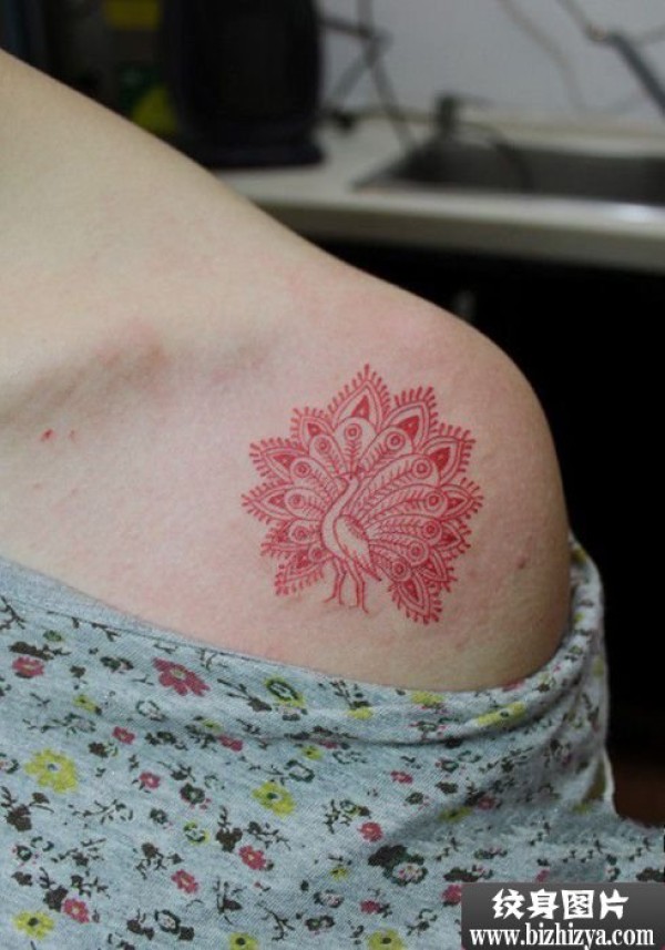 红色小孔雀唯美肩部纹身图案图片_肩部纹身图案大全_纹身图吧