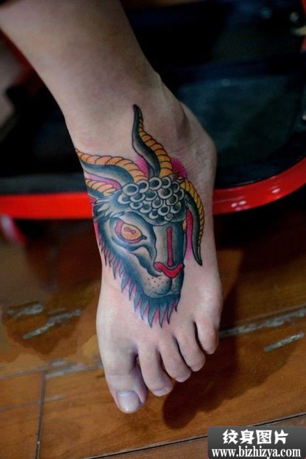 脚背霸气羊角头纹身图案图片_脚部纹身图案大全_纹身图吧
