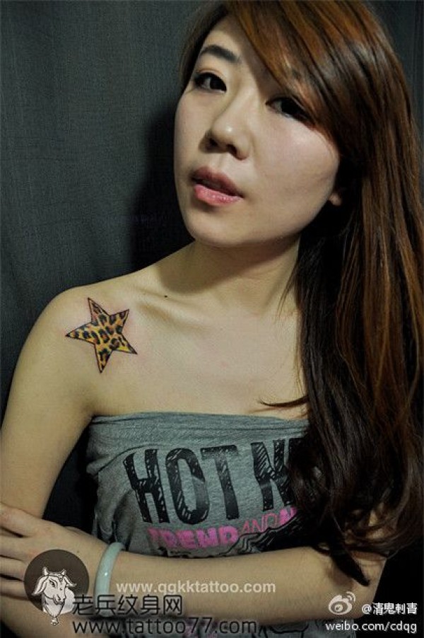 美女肩部超酷的五角星豹纹纹身图案_肩部纹身图案大全_纹身图吧