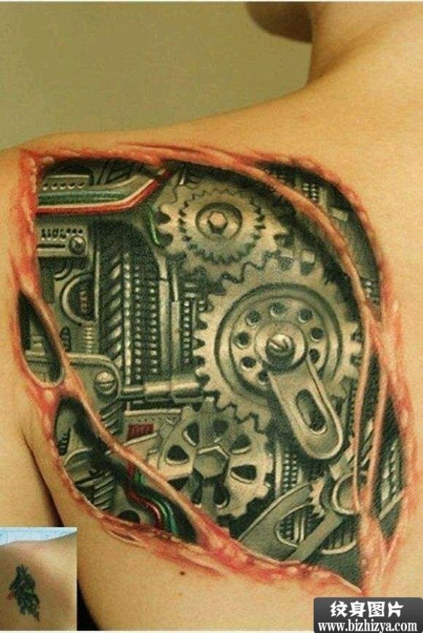 左后肩部逼真的机械齿轮皮肤纹身作品_肩部纹身图案大全_纹身图吧