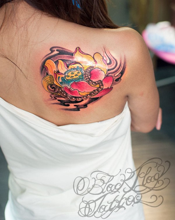 一款女性肩背彩色莲花纹身图案由武汉最好的纹_肩部纹身图案大全_纹身图吧