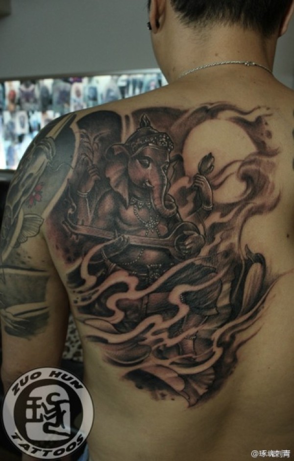 后肩背一款时尚经典的象鼻神纹身图案_肩部纹身图案大全_纹身图吧