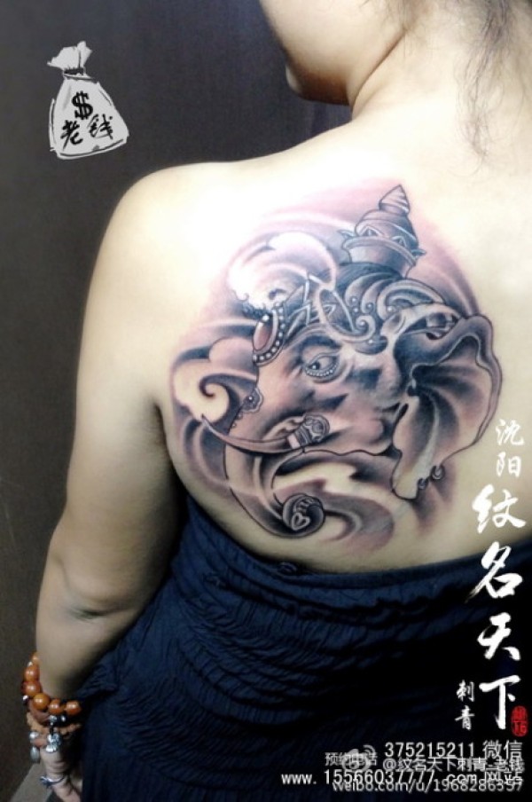 美女后肩背经典的黑灰象神纹身图案_肩部纹身图案大全_纹身图吧