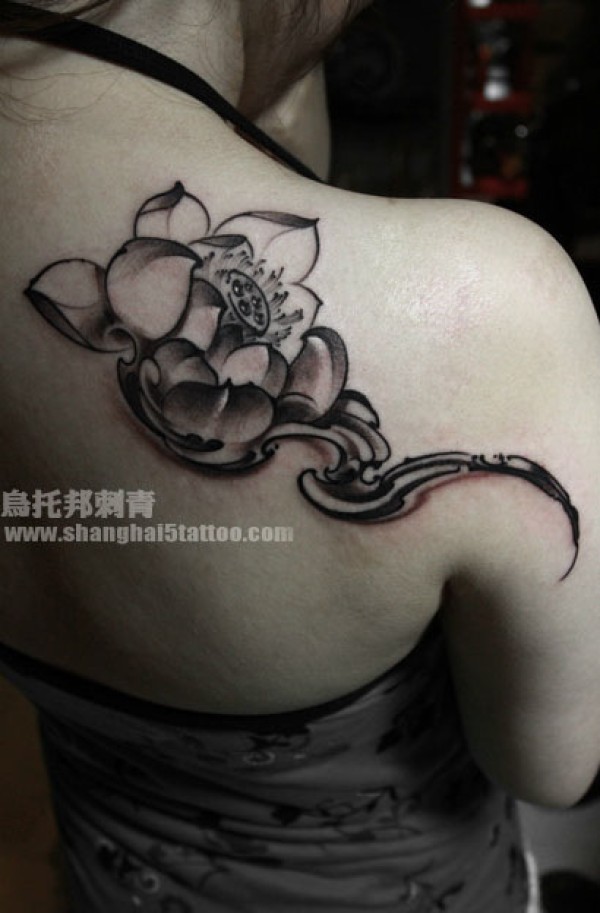 美女肩背时尚潮流的黑灰莲花纹身图案_肩部纹身图案大全_纹身图吧