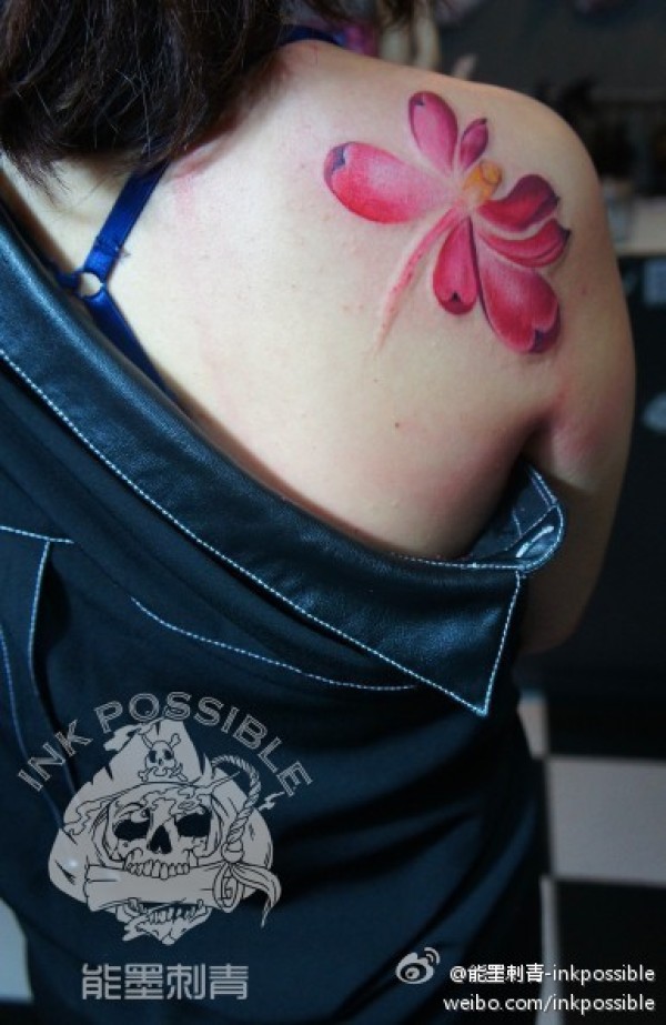 美女肩背唯美好看的彩色莲花纹身图案_肩部纹身图案大全_纹身图吧