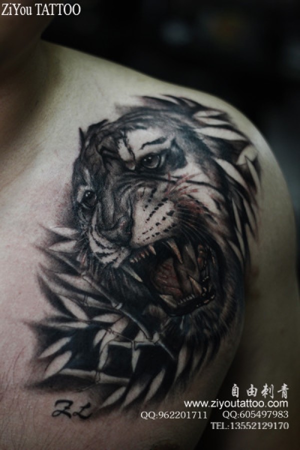 肩膀处超酷经典的虎头纹身图案_肩部纹身图案大全_纹身图吧