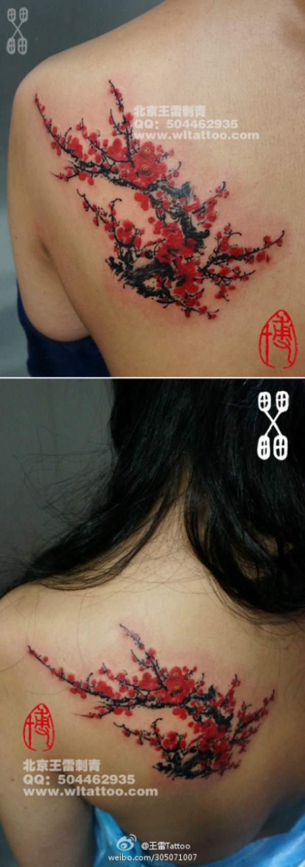 美女后肩背漂亮潮流的梅花纹身图案_肩部纹身图案大全_纹身图吧