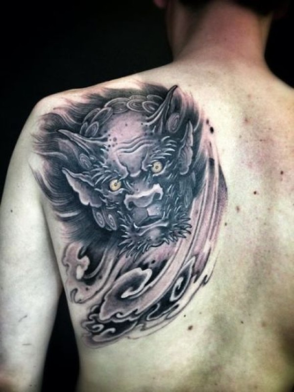 男人后肩背很酷的唐狮子纹身图案_肩部纹身图案大全_纹身图吧