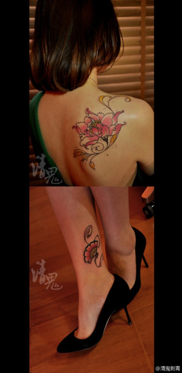 美女肩膀好看的彩色莲花与腿部小扇子纹身图案_肩部纹身图案大全_纹身图吧