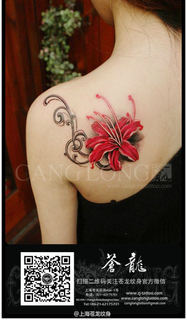 美女肩背漂亮时尚的彩色彼岸花纹身图案_肩部纹身图案大全_纹身图吧