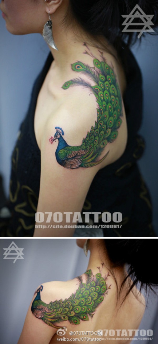美女肩膀处漂亮的彩色孔雀纹身图案_肩部纹身图案大全_纹身图吧