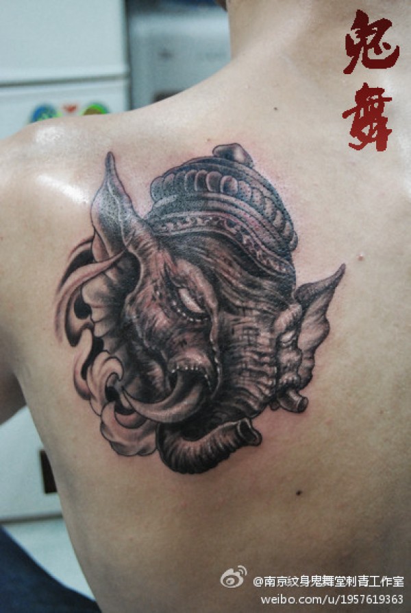 男人肩背凶悍的象神纹身图案_肩部纹身图案大全_纹身图吧