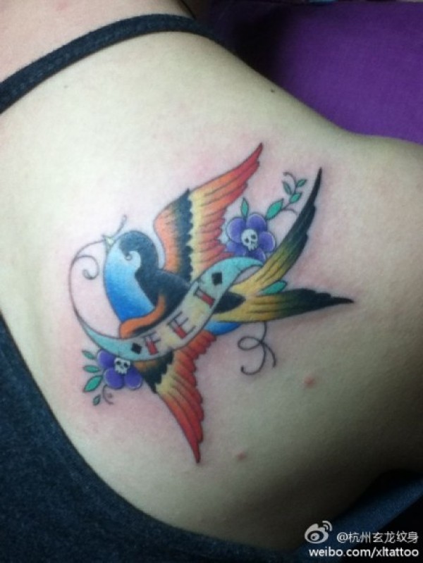 女孩子肩背好看的彩色小燕子纹身图案_肩部纹身图案大全_纹身图吧