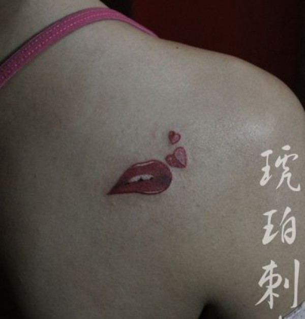 女孩子肩背漂亮的彩色唇印纹身图案_肩部纹身图案大全_纹身图吧