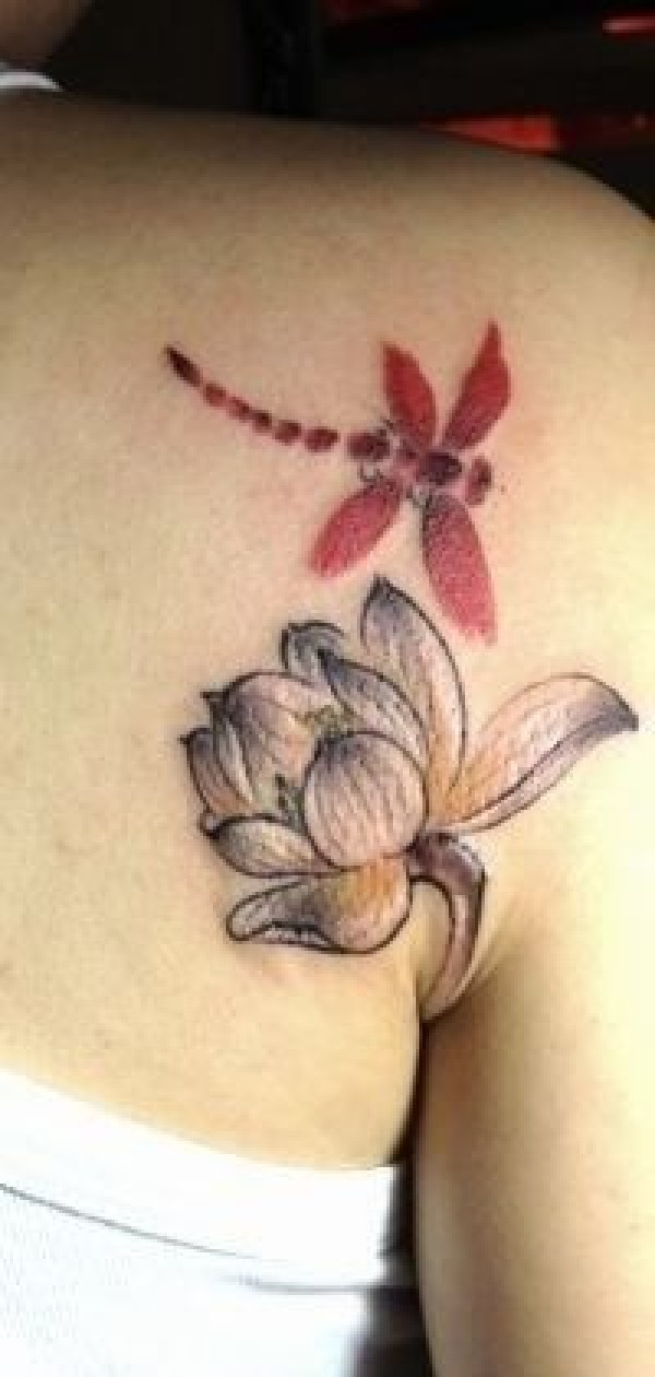 女孩子肩背莲花与蜻蜓纹身图案_肩部纹身图案大全_纹身图吧