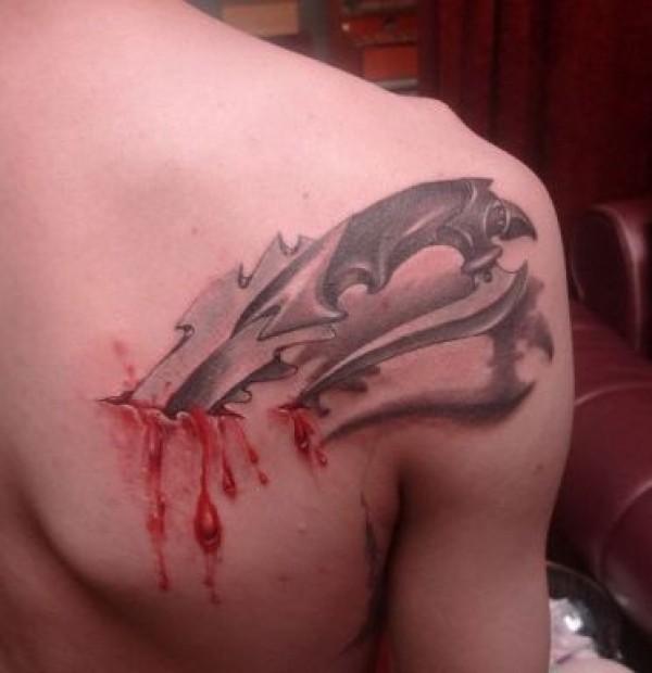 另类的肩背刺进皮肤的匕首纹身图案_肩部纹身图案大全_纹身图吧