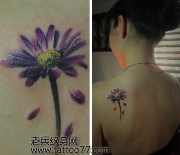 女孩子肩背精美的彩色小邹菊纹身图案_肩部纹身图案大全_纹身图吧
