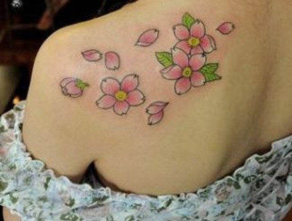 女孩子肩部精美时尚的彩色樱花纹身图案_肩部纹身图案大全_纹身图吧